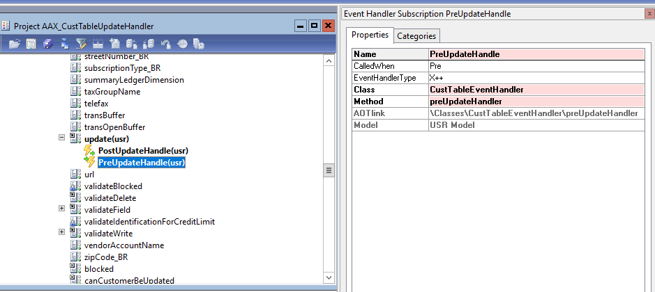 First, let's create a called CustTableEventHandler. This will hold the handles we are going to create for the various events. Now, add two methods called PreUpdateHandler and PostUpdateHandler.