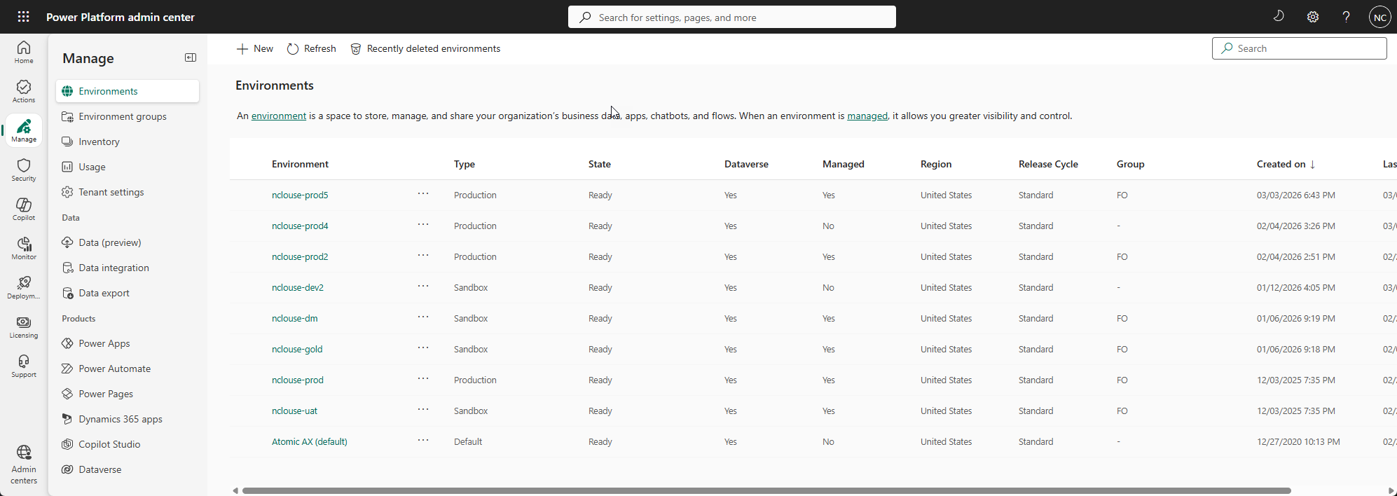 In PPAC, that limit is gone. You can create as many production environments as you need, as long as you have the capacity and licenses to support them. They all show up in a single view in PPAC.