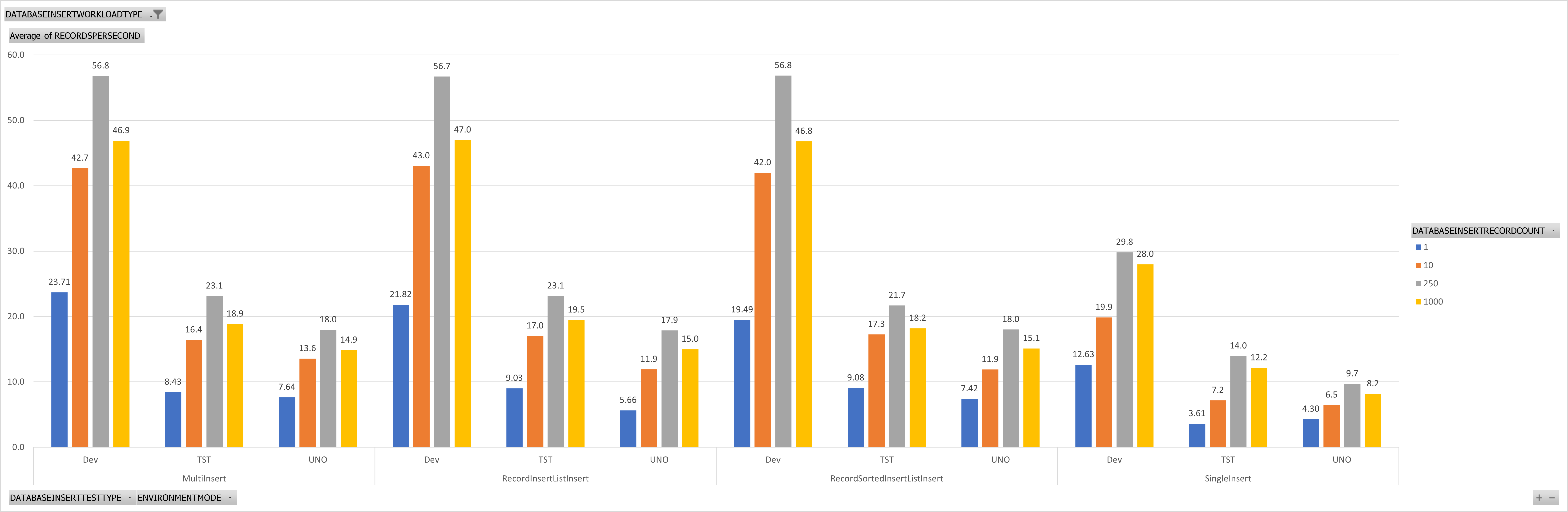 The explanation for this test can be found here. Here we have the sets of workloads on 3 different deployment topologies. Each topology was given the same workload using the code pattern linked earlier. Each topology was tested with a workload size of 1, 10, 250, and 1000. You can see the results below where a larger number are considered better. The "sweet spot" for this workload was at around 250. We can also see a large difference between the dev environment and the sandbox environment which supports the assertion that if something is "fine" in dev, it may be slow in a sandbox environment. We can also see the new UDE / UNO environment is slower than a sandbox environment which supports the assertion that if something is "fine" in a UDE environment, it will be "fine" in a sandbox and production by extension. This is exactly what we see with a code table. Most of this paragraph is copied from the article referenced earlier - but we can also note that CustTable inserts are slower - much slower. A code table insert in an T2 Sandbox can sustain an average of 100.8 records inserts per second while the same T2 can only handle 14.0 average record inserts per second. CustTable doing more work on more stuff ( indices, columns, etc ) and the result taking more time makes sense. However, I didn't expect such a large difference. 14 CustTable records inserted per second is quite bad.