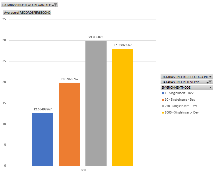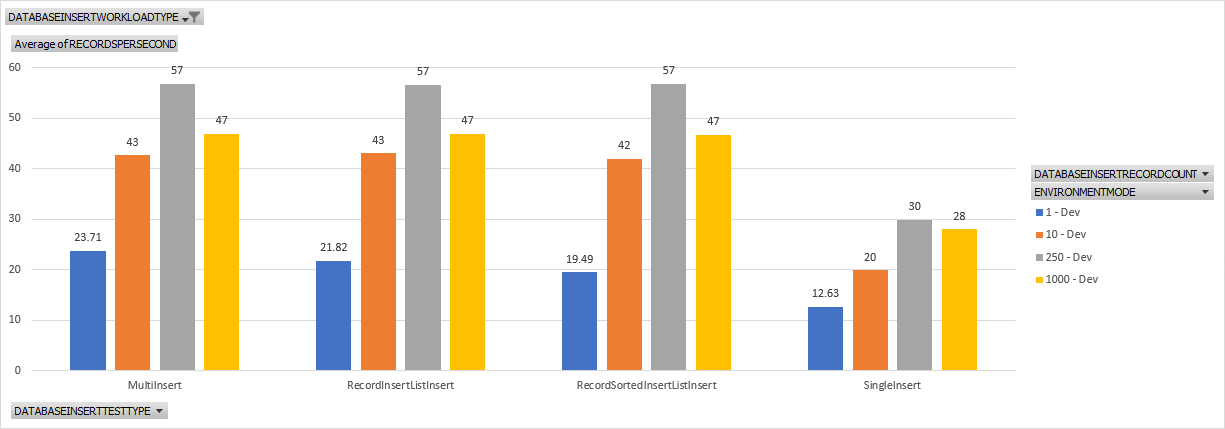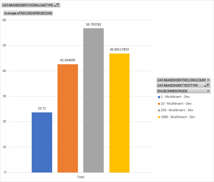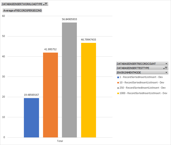 This is a chat showing records inserted per second when using a single insert pattern and the various throughputs in records per second for the test sizes of 1, 10, 250, and 1000. In general, as we do more work, its gets more efficient over time to a point. Inserting 1 record is the slowest from a throughput persective while around 250, give or take, is the fastest.