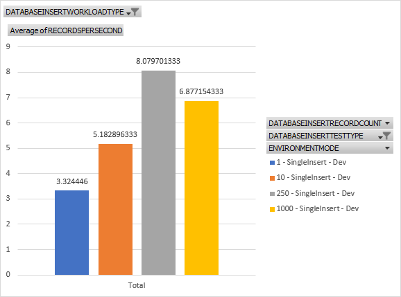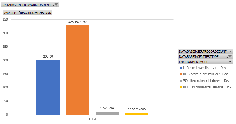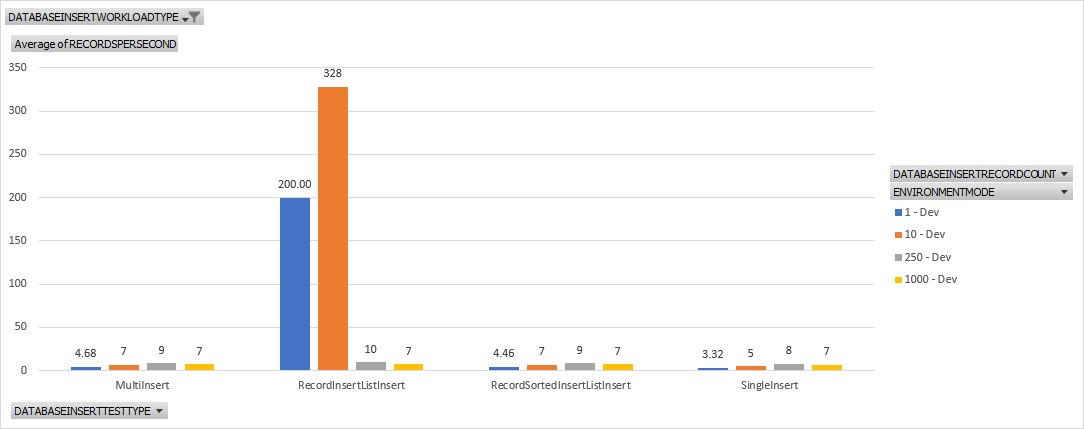 Using a RecordInsertList for different workload sizes gives us some surprising results. For workload sizes of 1 and 10, we can see that throughput in terms of records records per second is fairly high, compared to other options in the article but also compared to a workload size of 250 or 1000. I'm partially guessing on this but I think this suggests that in SQL Server, small set sizes operation in memory then commit to disk when the transaction commits. However, at some point, the workload gets too large for SQL to handle it in memory and it "drops down" to being disk based inside SQL Server, which is slower. For SQL people reading this, I think this is the difference between an @ temp table and a # temp table. It appears that the primary take away here is that if you are using a data entity to insert data in x++, use a RecordInsertList.