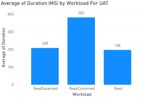 We're looking at the same set of tests and results that were ran against the VHD environment. However, we're getting a very different result for one set of tests. First, let's review average duration in MS by test type compared with the Local VHD. Everything in a UAT environment is faster so that's initially good news. Compared to our last diagram, our slowest set of tests is when we execute 2 requests ( 1 for a line and 1 for its header ). This is more than likely just simple network lag from the tests that are running on my home network and UAT being in the cloud.